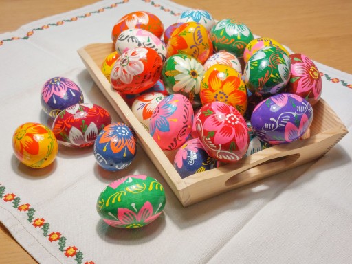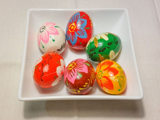Pisanki wykonane z drewna i ręcznie pomalowane w piękne, jaskrawe wzory i kolory.