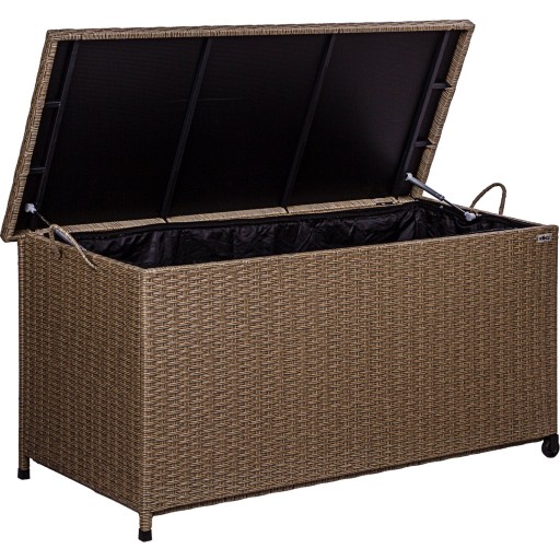 Skrzynia będzie elegancką ozdobą tarasu, ogrodu, werandy, a także mieszkania. Zapewnia dużą ilość miejsca do przechowywania akcesoriów ogrodowych, takich jak poduszki na meble, koce, zabawki do basenu i inne przedmioty do ogrodu. Jej prosta forma daje duży potencjał i pozwala na rozwinięcie wyobraźni przy tworzeniu własnych projektów. Świetnie prezentuje się zarówno samodzielnie jak również w zestawieniu z innymi modelami. Warto zainwestować w estetyczne i trwałe produkty z technorattanu, które nie tylko będą cieszyły oko, ale przede wszystkim posłużą nam przez długie lata w przeciwieństwie do podobnie wyglądających na zdjęciach produktów z plastiku.