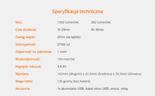 - Dioda Cree LED o maksymalnej mocy 1300 lumenów