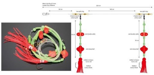 Zestaw stworzony głównie do połowu dorszy i morszczuków. Dzięki zaokrąglonym hakom uzyskujemy efekt samo-zacięcia. Stworzony do łowienia z dużym obciążeniem na znacznych głębokościach 50-300 metrów, najlepiej sprawdza się przy łowieniu nieco nad dnem. Kręcące się "śmigła" prowokują ryby do brania.