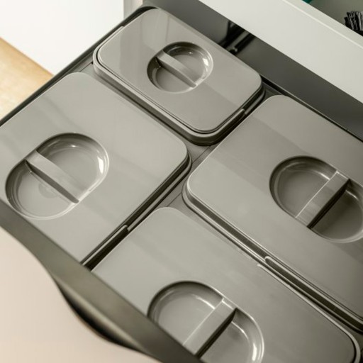 Kosz na śmieci przeznaczony jest do szuflad z frontem 60 cm. W skład produktu wchodzą trzy pojemniki z pokrywami o pojemności 15 L i jeden pojemnik z pokrywą o pojemności 7 L oraz stelaż.