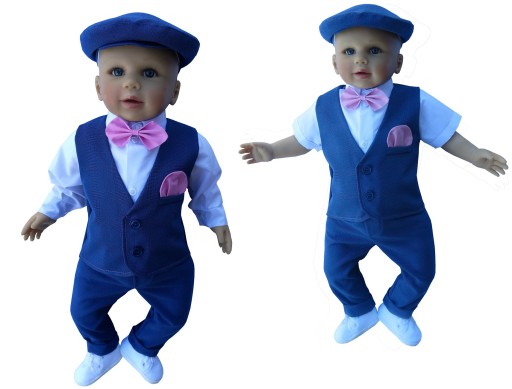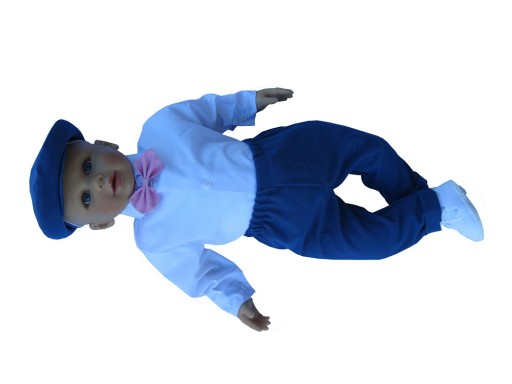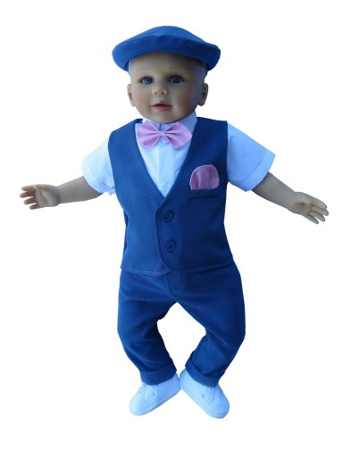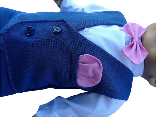 - KAMIZELKA NIEBIESKA - WYKONANA Z TKANINY GARNITUROWEJ, ZAPINANA NA DWA GUZICZKI, PRZYOZDOBIONA RÓŻOWĄ POSZETKĄ ( CHUSTECZKĄ ), OBSZYTA RÓŻOWĄ NITKĄ NA PRZODZIE.