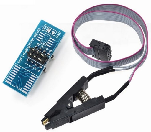Klips pomiarowy umożliwiaja programowanie/odczyt układów w obudowach SO8 SOP8 SOIC8 bez konieczności ich wylutowywania. Posiada mocną sprężynę, zapewniającą dobry docisk do układu.