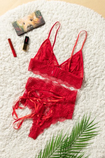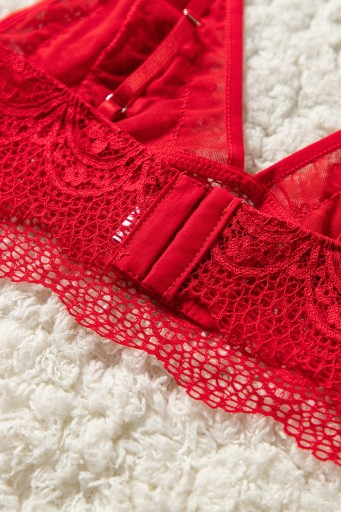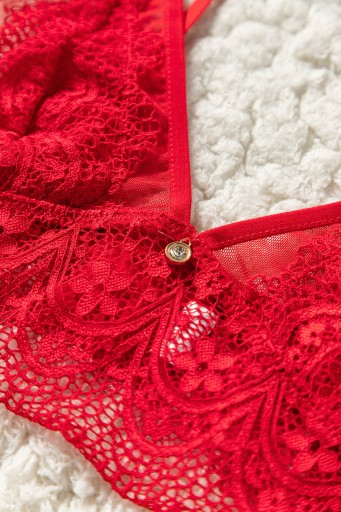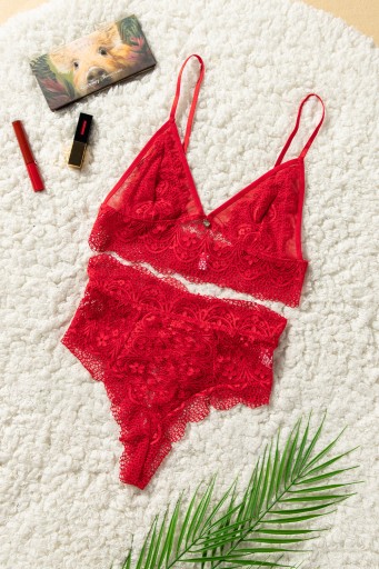 Seksowny komplet wykonany z delikatnej koronki w kwiaty. Komplet składa się z dwóch części: biustonosza oraz stringów.