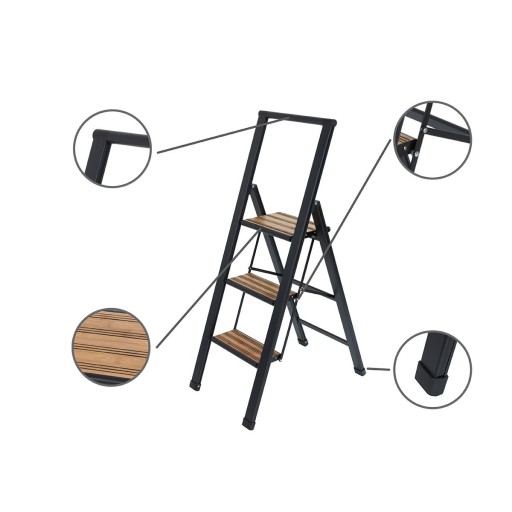 Drabinka składana czarna, 3 stopnie, renomowanej niemieckiej marki WENKO posiada lekką aluminiową konstrukcję, dzięki czemu wyjątkowo łatwo ją przenieść, a nawet wnieść po schodach. Jest więc odpowiednia nawet dla kobiet czy osób starszych. Ponadto bardzo łatwo się ją składa, dzięki czemu nie zajmuje dużo miejsca w domu. Drabina posiada 3 stopnie z gumowymi paseczkami, które zapewniają, że schodki są antypoślizgowe. Gwarantują one 100% bezpieczeństwa użytkowania produktu.