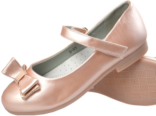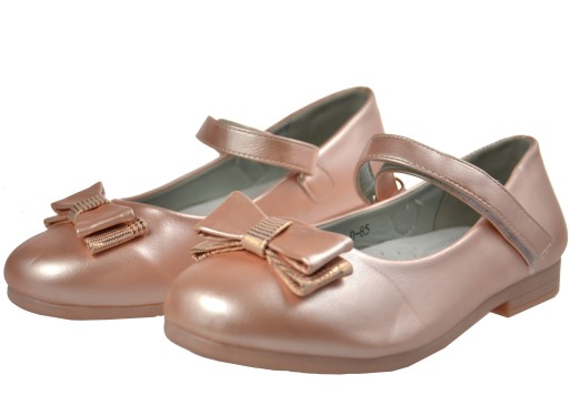 Śliczne pantofelki dziewczęce wykonane ze skóry ekologicznej z wyprofilowana skórzaną wkładka. W ślicznym kolorze z lekkim mieniącym się efektem. Wyglądają ślicznie na żywo. Buciki zapinane na rzepy. Zdobione elegancką mieniącą się kokardką