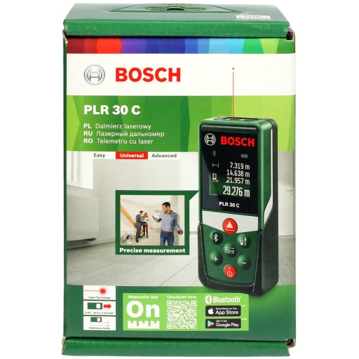 Dalmierz firmy BOSCH model PLR 30 C przeznaczony do szybkich, łatwych i co ważne, bardzo dokładnych pomiarów przy pomocy promienia laserowego. Za naciśnięciem przycisku mierzy długości, powierzchnie i kubatury, a wynik pomiaru ukazuje się na dużym, ciekłokrystalicznym wyświetlaczu dalmierza.