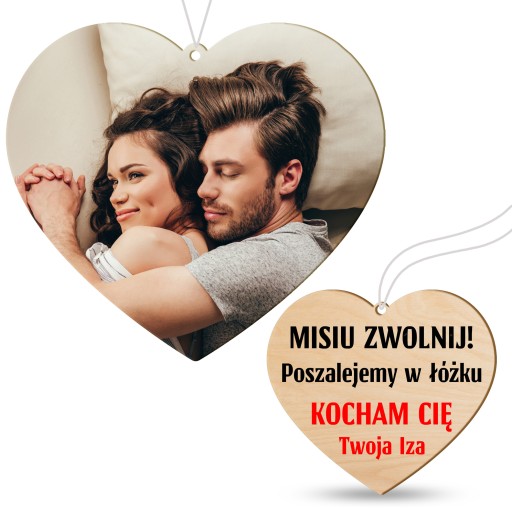 Dwustronna zawieszka z DREWNA na lusterko samochodowe w kształcie serca z nadrukowanym Twoim zdjęciem.