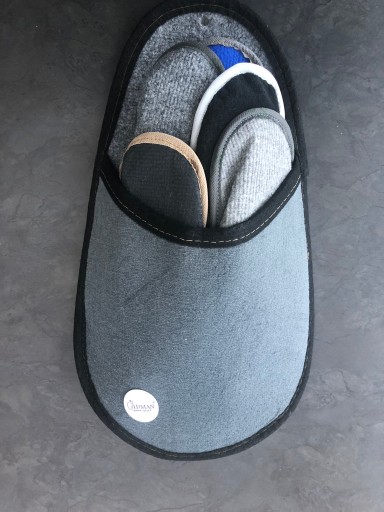 Kapcie są pakowane losowo w różnych kolorach. Kieszeń główna (duży kapeć) jak na zdjęciu szara.