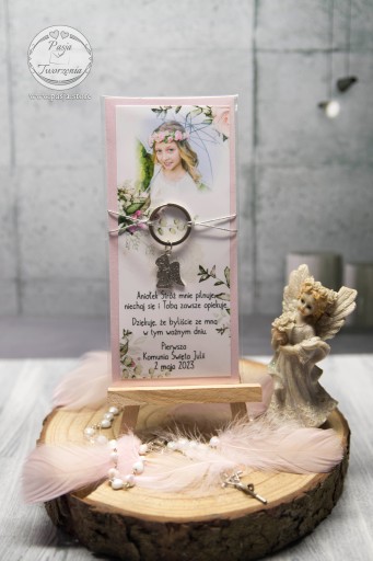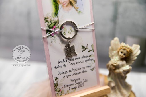 Podziękowanie dla gości w formie breloczka z aniołkiem.