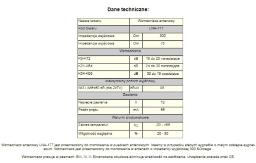 Wzmacniacz antenowy dopuszkowy LNA-177 30dB ekranowany