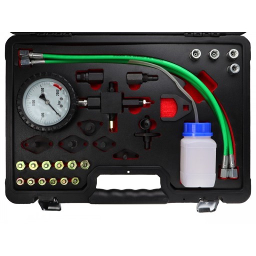Wysokociśnieniowy, analogowy tester wysokiego ciśnienia z różnymi przewodami połączeniowymi do sprawdzania pompy wysokiego ciśnienia/układu podczas rozruchu korbowego lub pracy. Skala odczytów od 0-2000 bar. Tester posiada wbudowany zawór zwalniający ciśnienie, który ogranicza maksymalne ciśnienie do ok. 1500 bar, aby zapobiec uszkodzeniu pompy. Tester wyposażony jest w dwa zestawy elastycznych węży umożliwiających podłączenie do trudno dostępnych miejsc.