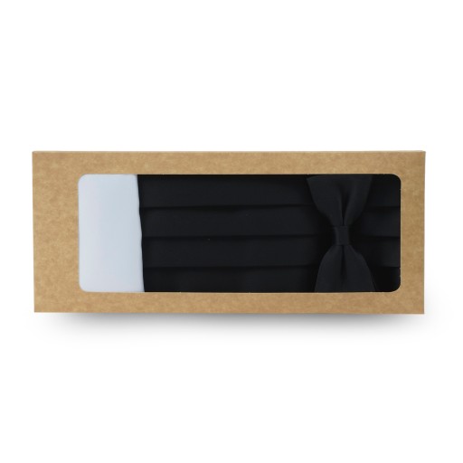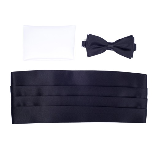 Elegancki zestaw pas smokingowy, muszka i poszetka, całość zapakowana w eleganckie prezentowe pudełko.