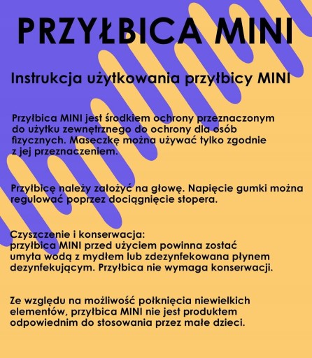 Mini maska jest środkiem ochrony przeznaczonym do użytku zewnętrznego do ochrony dla osób fizycznych. Maseczkę można używać tylko zgodnie z jej przeznaczeniem.
