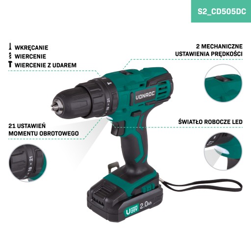 Następnie proszę spojrzeć na naszą oddzielną wiertarkę udarową CD505DC, dostarczaną bez akumulatora i szybkiej ładowarki. Jeśli chcesz połączyć wkrętarkę z innymi urządzeniami z platformy VONROC Vpower 20V, to wystarczy akumulator 20V i szybka ładowarka. Wybierz tylko to, czego potrzebujesz, za konkurencyjną cenę!