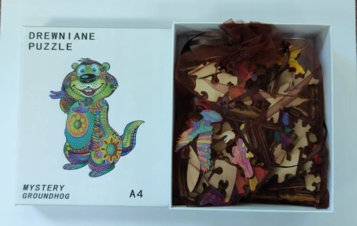 Drewniane Puzzle to zestaw składający się ze 124 elementów, do którego nie odnoszą się klasyczne zasady układania - puzzle nie mają regularnych krawędzi, ani klasycznych zakończeń. Ich oryginalność polega na kształcie obrazka - po ułożeniu ukazuje się sylwetka kolorowego Świstaka.