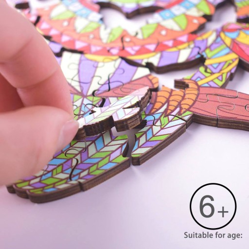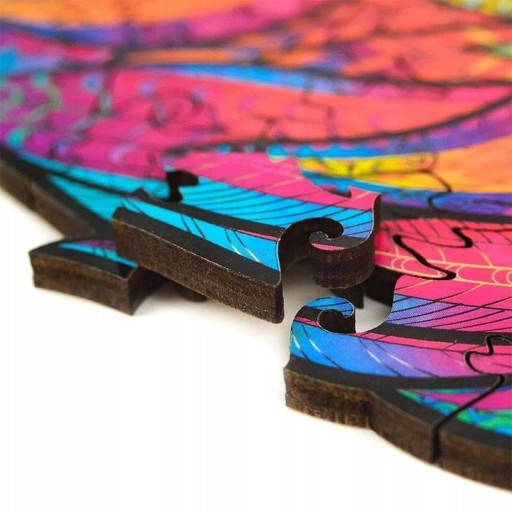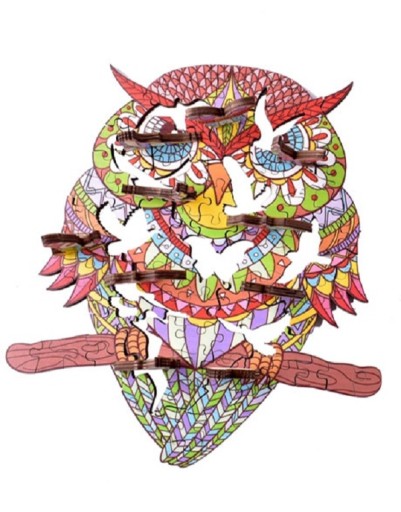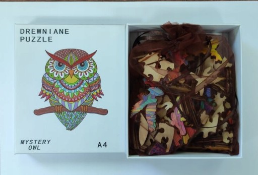Drewniane Puzzle to zestaw składający się ze 125 elementów, do którego nie odnoszą się klasyczne zasady układania - puzzle nie mają regularnych krawędzi, ani klasycznych zakończeń. Ich oryginalność polega na kształcie obrazka - po ułożeniu ukazuje się sylwetka kolorowej Sowy.