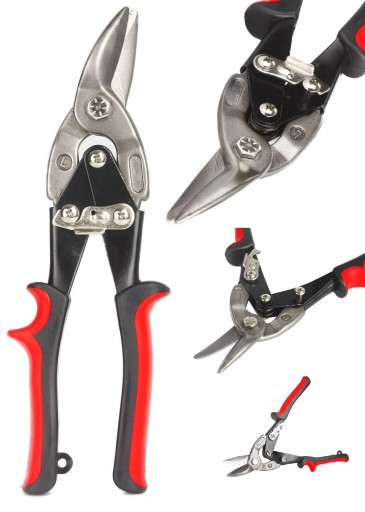 Nożyce do cięcia blachy , solidne ostrza nożyc, dodatkowo ząbkowane, co zapobiega ześlizgiwaniu się z ciętego materiału. Rękojeść o ergonomicznym kształcie zapewnia pewny i wygodny chwyt narzędzia. Nożyce posiadają mechanizm blokujący w pozycji zamkniętej. Specjalnie zaprojektowane rączki z miejscem na palec wskazujący oraz zaczep.