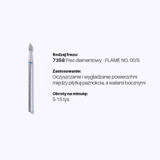 - Frez diamentowy FLAME NO.02/S, Frez diamentowy FLAME NO.01/H oraz Frez diamentowy Flame No. 00/S do oczyszczania oraz wygładzania powierzchni między paznokciami a wałami bocznym;