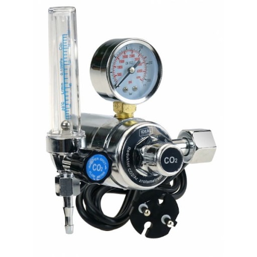 Jednostopniowy reduktor butlowy ciśnienia wylotowego z rotametrem i podgrzewaczem. Rodzaj gazu: CO2, znamionowe ciśnienie wlotowe: 200 bar, przepustowość: 25 l/min, zasilanie: 36 V