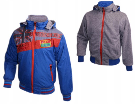 Kurtka przejściówka dwustronna, zapinana na suwak, po bokach kieszenie. kaptur odpinany