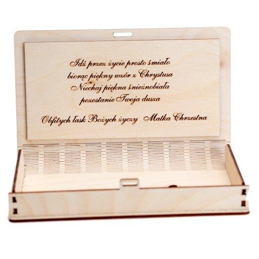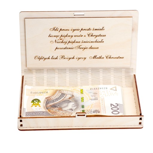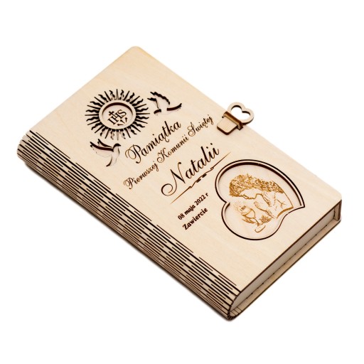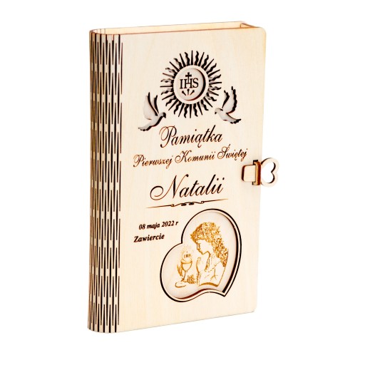 Pudełeczko z indywidualnym grawerem na pieniądze w formie książki jako prezent na Pierwszą Komunię św