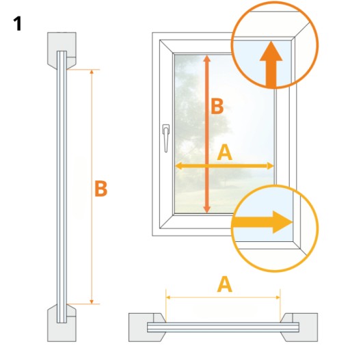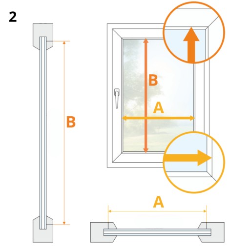 Szerokość zamówienia (A) to odległość między krawędziami światła szyby. Innymi słowami należy zmierzyć odległość od uszczelki do uszczelki przy szybie.