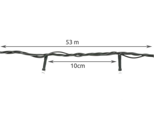 - SPECYFIKACJA – rodzaj oświetlenia; LED; barwa światła: ciepłe białe; ilość diod: 500; klasa wodoodporności: IP44; zasilanie: sieć energetyczna; moc: 15W; napięcie: 31V; długość całkowita: 53 m;