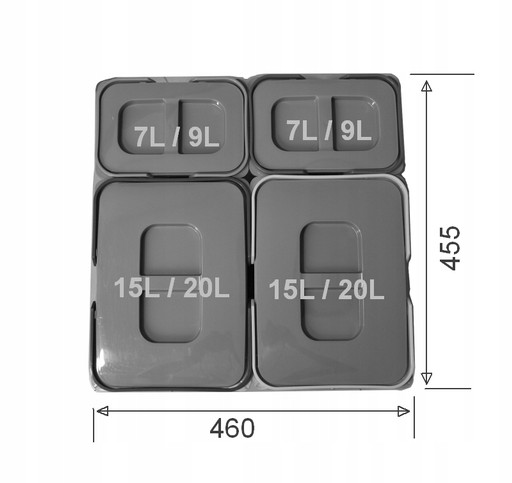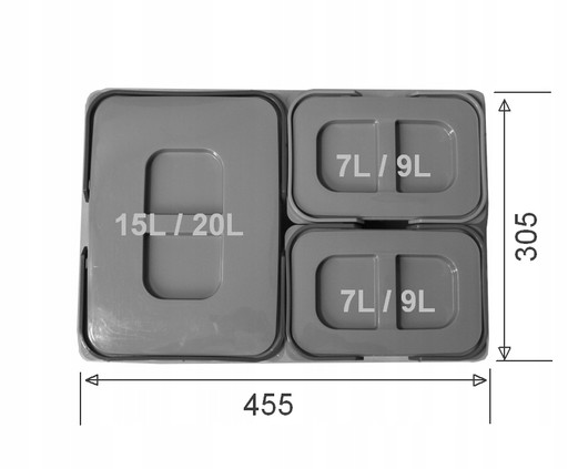 W skład systemu ekoSORTER do segregacji odpadów wchodzą pojemniki o wysokości 30cm i 40cm oraz pojemności 7L 9L 15L 20L z możliwością dokupienia pokrywy. Elementem dopełniającym jest kuwetka na drobiazgi o pojemności 1,5L