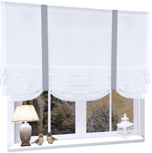 Roletka wykonana z tkaniny w kolorze śnieżnobiałym. U góry wszyta taśma 5 cm. Można przypinać żabkami lub wsuwać na tunel.