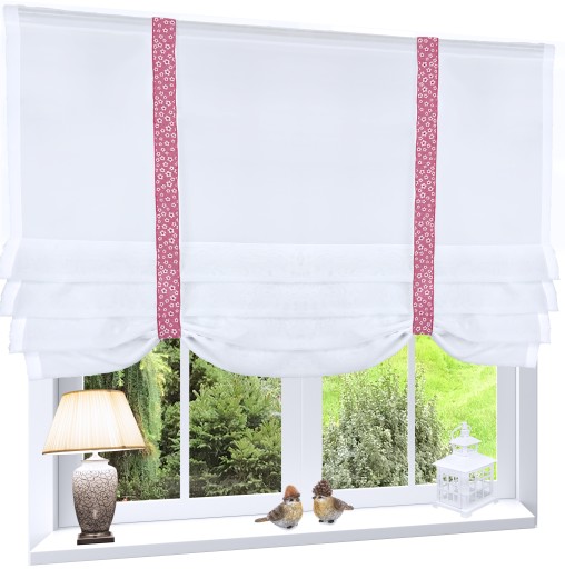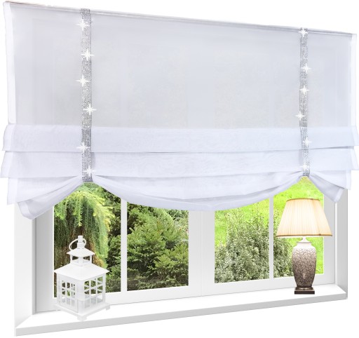Roletka wykonana z tkaniny w kolorze śnieżnobiałym. U góry wszyta taśma 5 cm. Można przypinać żabkami lub wsuwać na tunel.