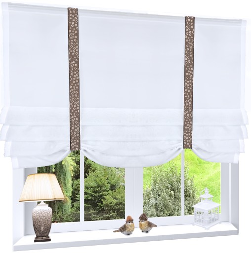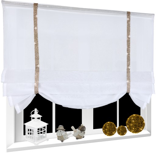 Roletka wykonana z tkaniny w kolorze śnieżnobiałym. U góry wszyta taśma 5 cm. Można przypinać żabkami lub wsuwać na tunel.