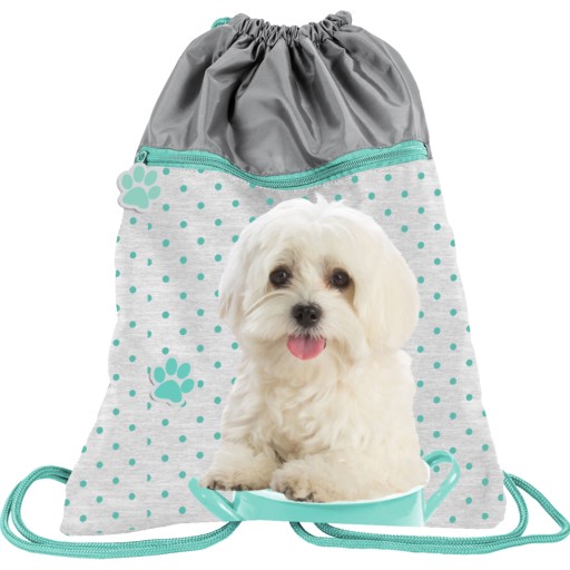 Worek gimnastyczny 2-komorowy z kieszenią na strój Pies Maltańczyk. Oryginalna szaro-turkusowa kolorystyka nadaje mu szczególnego uroku. Uwagę przyciąga nadruk z wizerunkiem białego psa maltańczyka o bystrych, brązowych oczach, który spogląda na miłośników czworonogów, wychylając się z turkusowego garnuszka. Worek zdobią również nadrukowane, małe, turkusowe kropeczki i pullery przy zamkach w kształcie psiej łapki. Wymarzony worek dla wszystkich dziewczynek, które uwielbiają małe, białe, słodkie pieski. Worek idealnie pasuje do innych produktów z tej serii.