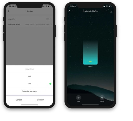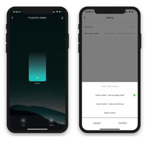 - Współpracuje z tradycyjnym włącznikiem (bistabilnym)