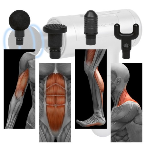 Silnik urządzenia wprawia wybraną końcówkę w wibracje, dzięki czemu mięśnie są rozluźniane a ich regeneracja jest przyspieszona.
