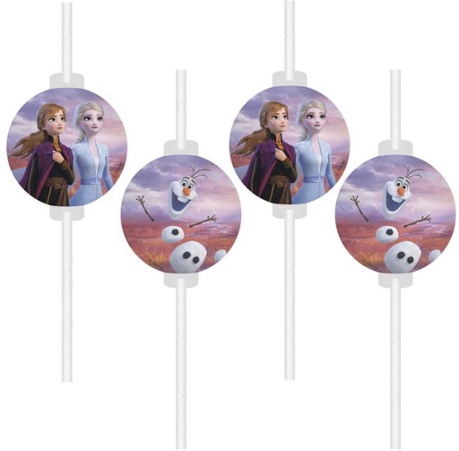 Zestaw słomek z bohaterami Krainy Lodu . W komplecie znajdują się 4 słomki ozdobione medalionem z wizerunkiem Anny i Elsy oraz Olafem na odwrocie. Idealnie wkomponują się urodzinową dekoracje dla małej fanki Elsy...