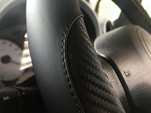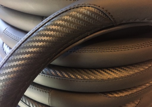 Pokrowiec na kierownicę z wysokiej jakości materiałów (ekoskóra połączona z imitacją karbonu).