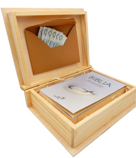 W szkatułce znajduje się Biblia Pismo Święte Starego i Nowego Testamentu z rybką