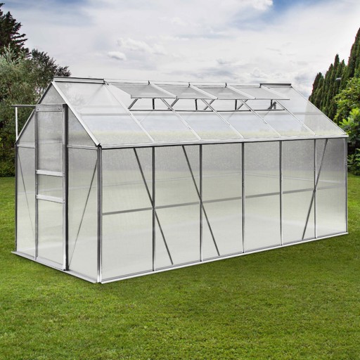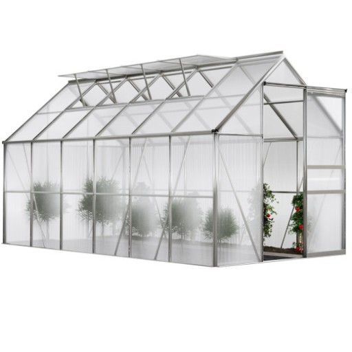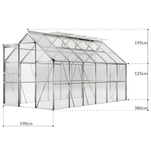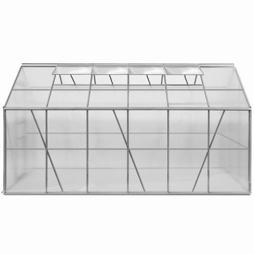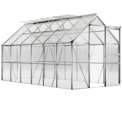 Szklarnia posiada 4 okna wentylacyjne dla optymalnej cyrkulacji powietrza oraz 2 rynny deszczowe. Rynna deszczowa kieruje strumień deszczu w dół szklarni.
