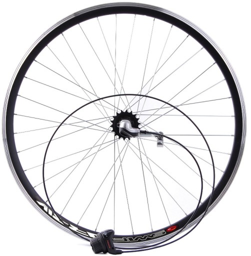 Tylne koło 24 calowe firmy Stars Circle z 3 biegową piastą Shimano Nexus i obrotową manetką. Precyzyjna przekładnia zintegrowana wewnątrz piasty jest niemalże niewrażliwa na warunki zewnętrzne. Dwukomorowa obręcz wykonana z aluminium gwarantuję wysoką wytrzymałość. Posiada 36 ocynkowanych szprych koloru srebrnego. Jest to idealne rozwiązanie dla rowerów miejskich oraz turystycznych.