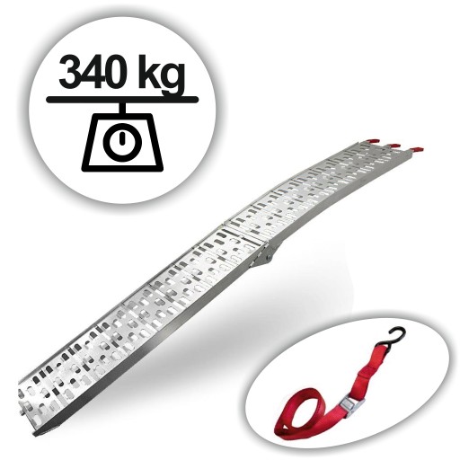 Rampa o udźwigu 340kg. Bardzo solidna i łatwa w użyciu. Idealna do załadunku motocykli, kosiarek, skuterów, sprzętu budowlanego, itp. Najazd jest składany, co ułatwia transport i przechowywanie.