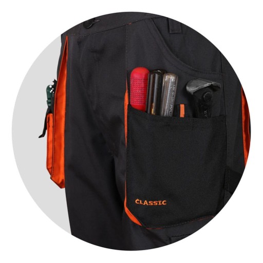- Dodatkowe kieszenie na wkładki nakolannikowe podtrzymują nakolanniki, dzięki czemu nie przesuwają się one w trakcie pracy zapewniając wygodę w każdej pozycji