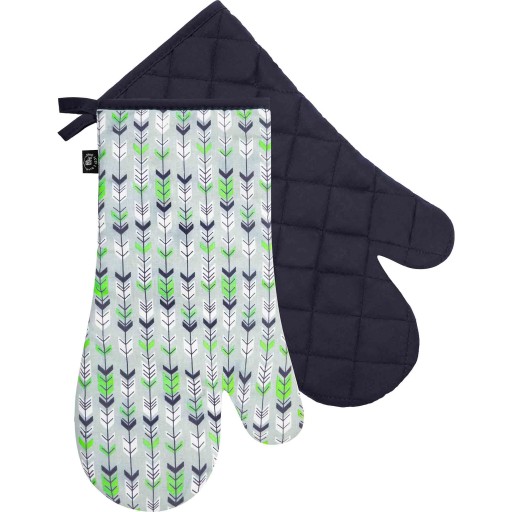 Komplet rękawic kuchennych w rozmiarze 18x33 cm został wykonany z naturalnej, bawełnianej przędzy oraz wypełniony poliestrową pianką. Jest niezastąpionym elementem w kuchni, gdyż zabezpiecza dłonie przed kontaktem z wysoką temperaturą podczas gotowania i pieczenia. Wzdłuż krawędzi posiada przewieszkę, umożliwiającą zawieszenie na haczyku.