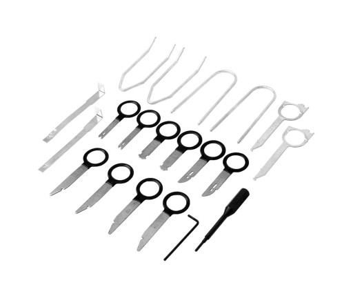 Uniwersalny zestaw 20 sztuk wyjmaków do montażu i demontażu radia oraz nawigacji samochodowej. Komplet składa się z wielu rodzajów kluczy (pojedynczych, podwójnych oraz rurkowych) o zróżnicowanej grubości. Obowiązkowe wyposażenie wszystkich osób zajmujących się naprawami samochodowej elektryki. W zestawie znajduje się wygodny, dedykowany futerał do wyjmaków.