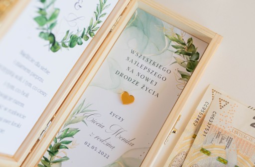 Pudełko prezentuje się jeszcze piękniej na żywo, drewniana ażurowa dekoracja i trwały grawer z imionami pary młodej będzie zachwycającą pamiątką na lata. W środku umieściliśmy wasze życzenia oraz małe złote serduszko tak by pudełko po otwarciu prezentowało się elegancko!