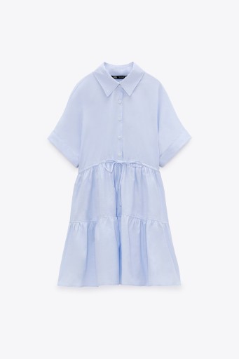 Sukienka o krótkim kroju. Klasyczny kołnierzyk. Krótki rękaw z podwinięciem. Wiązanie umożliwiające regulację szerokości w pasie. Zapięcie z przodu na ...