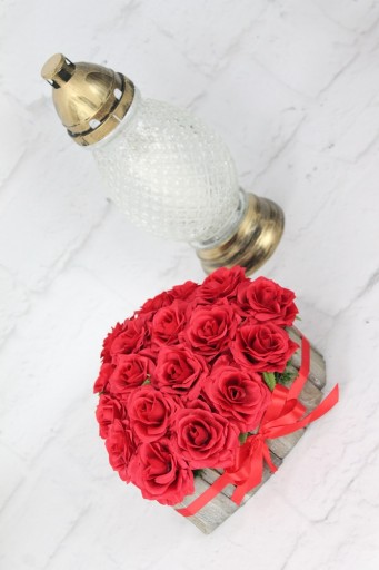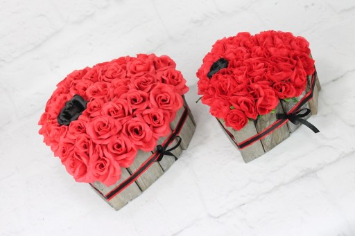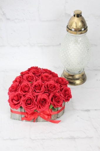 Niezwykle piękna i oryginalna kompozycja nagrobna w kształcie serca, wykonana z wysokiej jakości sztucznych kwiatów czerwonych róż w naturalnej podstawie z kory.