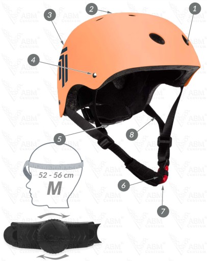 - Obwód głowy z regulacją rozmiaru kasku od 52 do 56 cm.