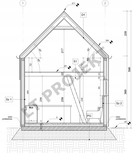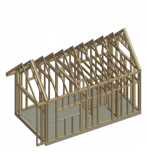 Projekt budynku rekreacyjnego do 35 m2 w technologii szkieletu drewnianego na zgłoszenie*. Budynek z wysokim, otwartym salonem i antresolą w formie sypialni, rozwiązanie to powiększa przestrzeń użytkową. Ściany szkieletowe z drewna C24 45x145mm posadowione na płycie fundamentowej. Projekt zawiera rysunki warsztatowe ścian szkieletowych.