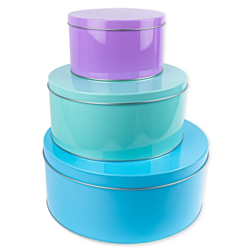 Komplet trzech metalowych, okrągłych puszek w przeuroczych pastelowych kolorach.